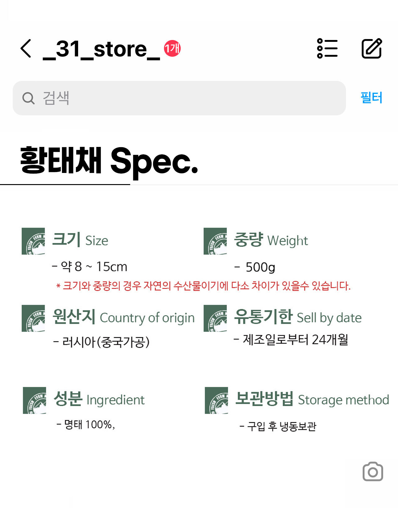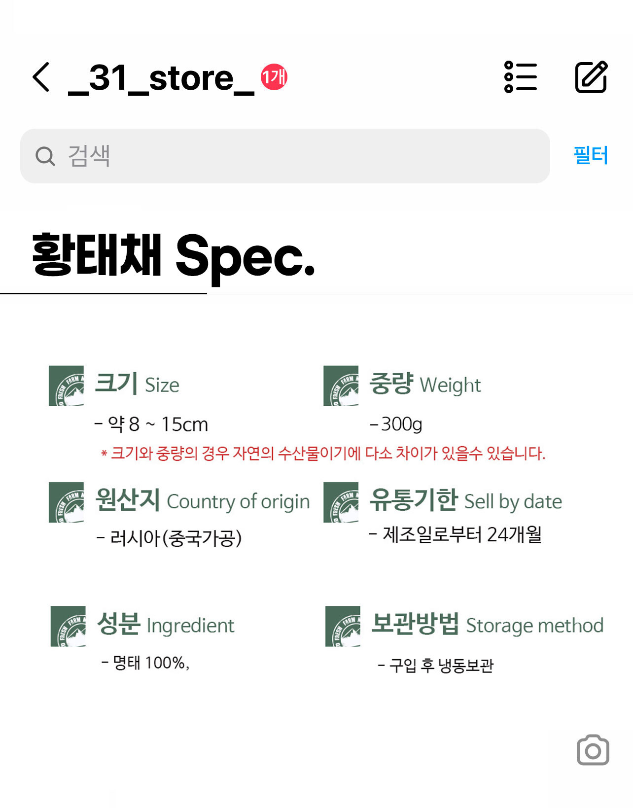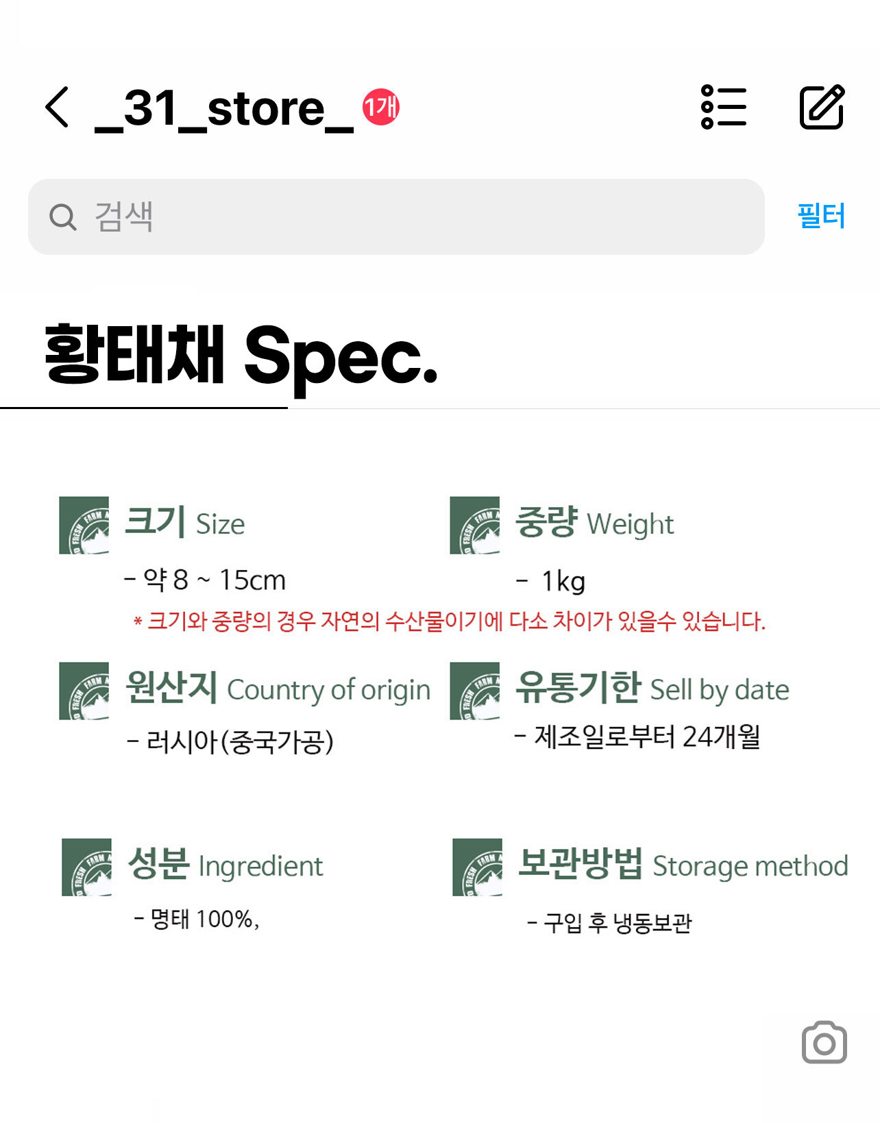 품목 또는 명칭 31건어물 상급 설원 황태채