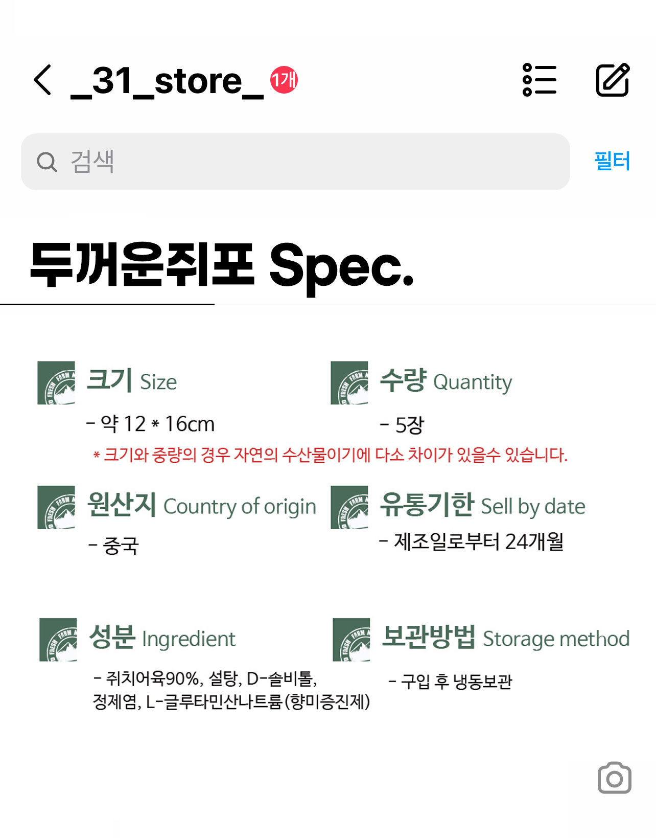 생산자 및 소재지 (수입품의 경우 생산자, 수입자 및 제조국) 소분원: 31건어물, 원산지: 중국