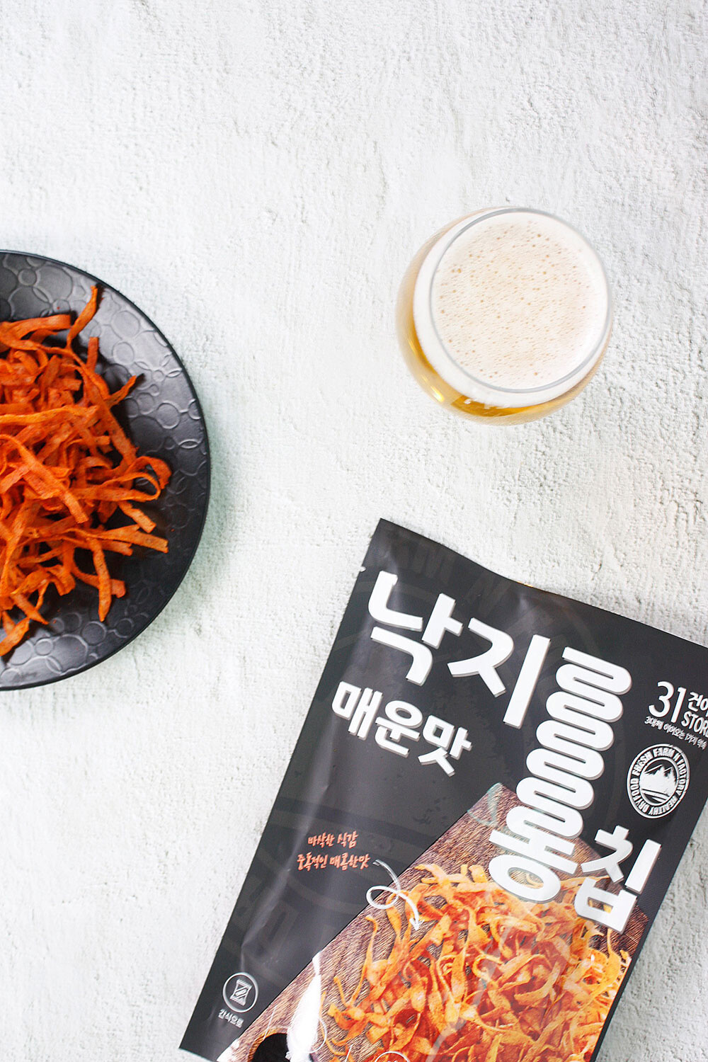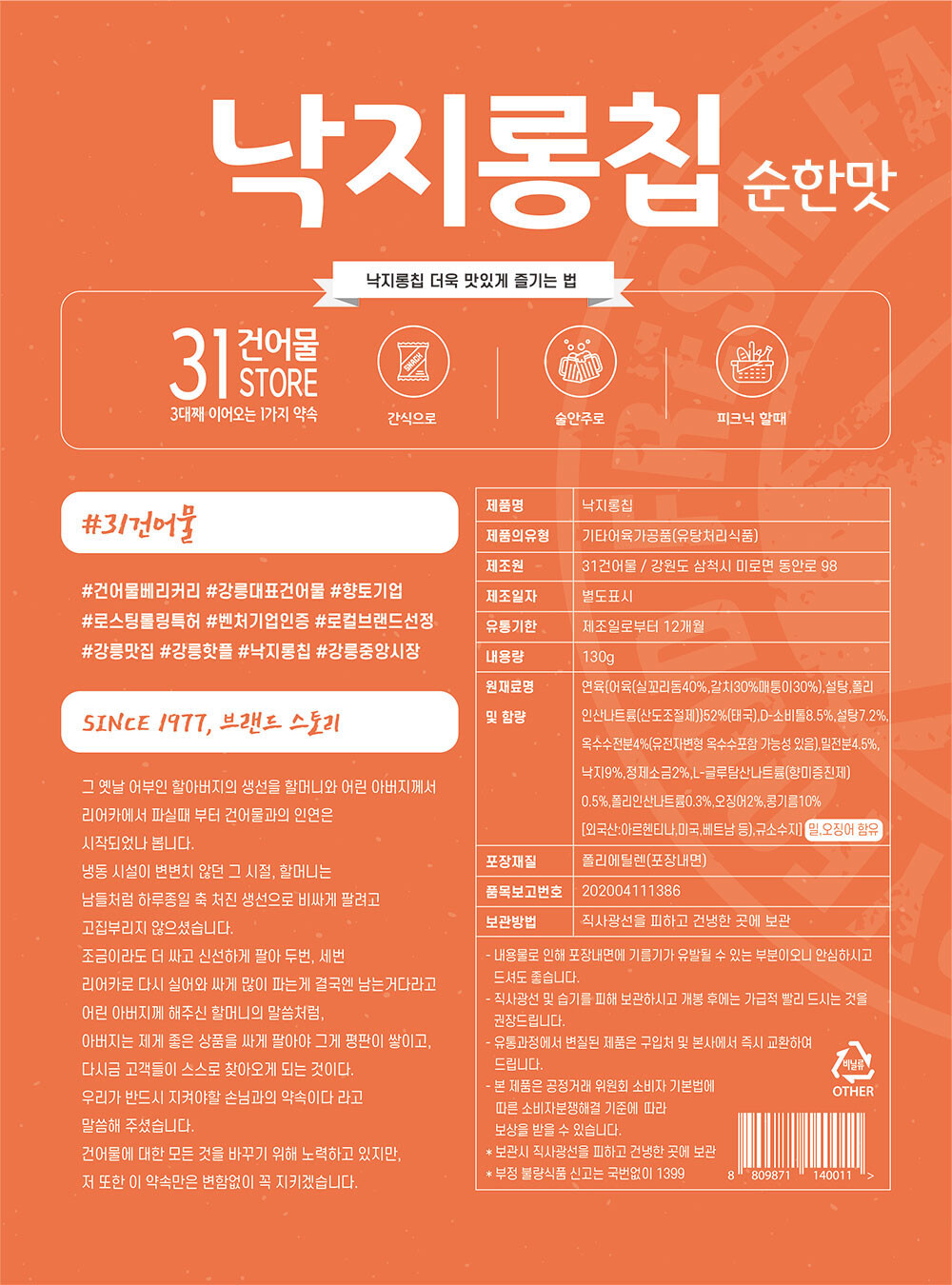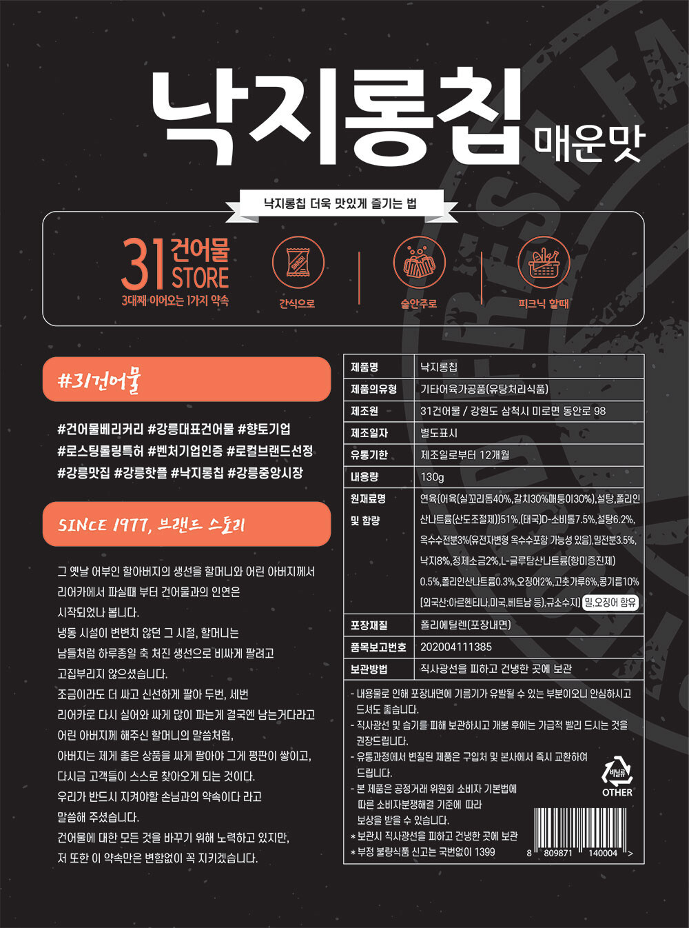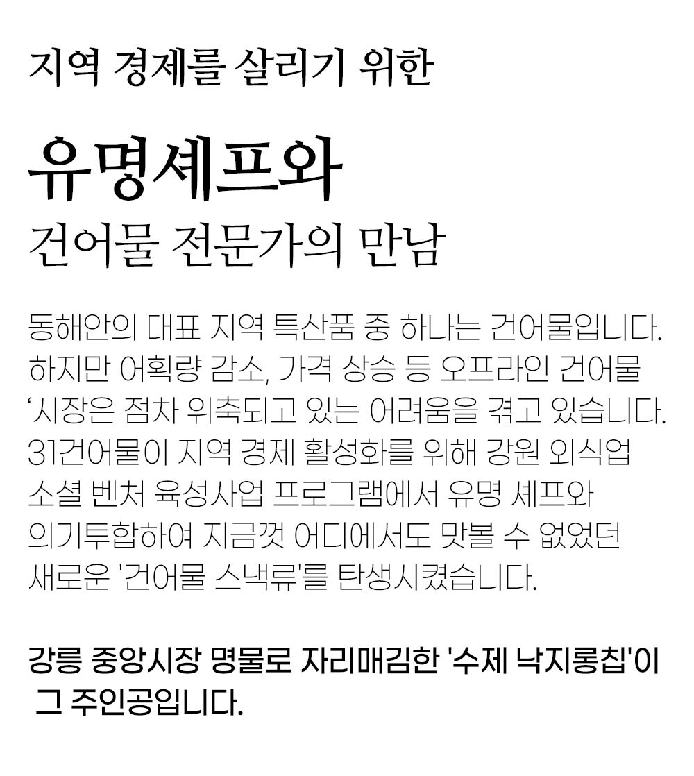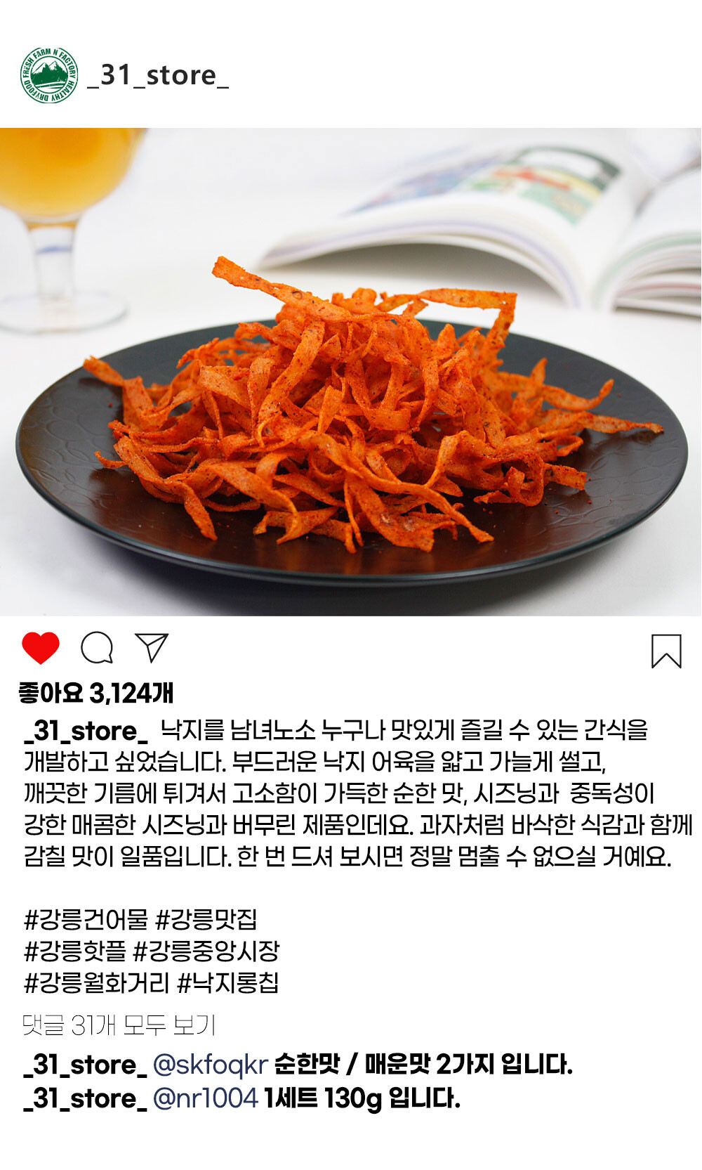 • 31건어물의 대표 상품 낙지롱칩입니다. 유명 미슐랭 쉐프의 디렉으로 탄생한 특제 시즈닝을 입힌 신개념 건어물 스낵입니다.