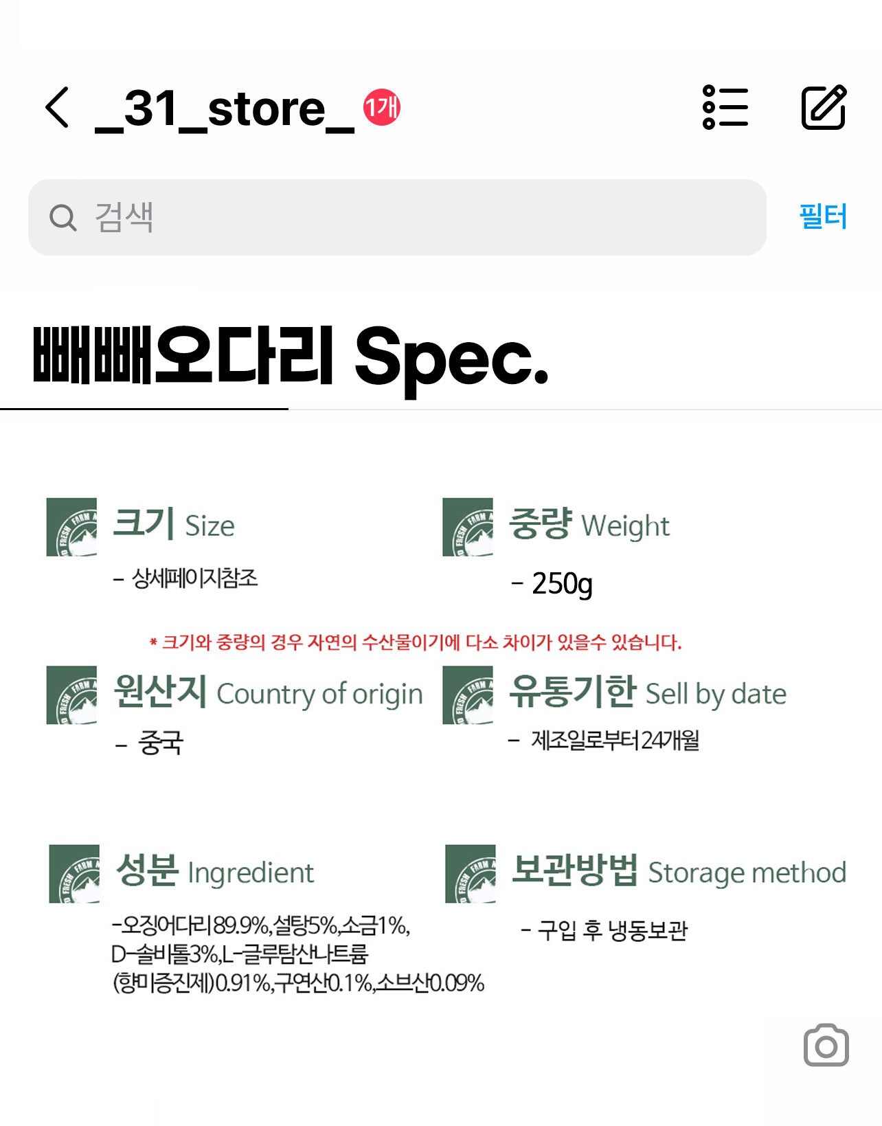 원재료명 (농수산물의 원산지 표시 등에 관한 법률에 따른 원산지 표시 포함) 및 함량 오징어다리89.8%(중국산),설탕5%,소금1%,D-소비톨3%,L-글루탐산나트륨(향미증진제)0.91%,구연산0.1%,소브산0.09%